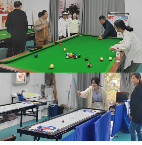 在活动的最后阶段,离退休党员与研究生党员们在离退休活动中心进行了一场别开生面的友谊赛。比赛项目包括台球、乒乓球和桌上冰壶球,现场气氛热烈而友好。通过比赛,不仅锻炼了身体,也增进了党员之间的交流和友谊。