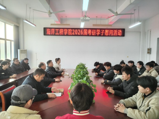 为切实做好考研学生服务保障工作,缓解学生备考压力,鼓舞冲刺士气。12月15日下午,海洋工程学院在机械南楼309会议室开展2026届考研学子慰问活动。学院党总支书记唐正康、院长缪泉明、副书记王海、学工办主任朱甜甜及全体2026届考研学子参加了本次活动,活动由王海主持。