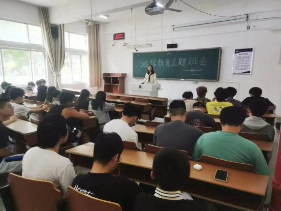 召开主题班会,号召学生积极学习诚信精神。加强宣传力度,传递正能量。通过形式多样的主题班会,让同学们了解国家助学贷款政策,普及贫困生资助等相关知识,宣传诚实守信事迹,增强法律意识,有效地将诚信教育转化为大学生自觉的素养与行为。